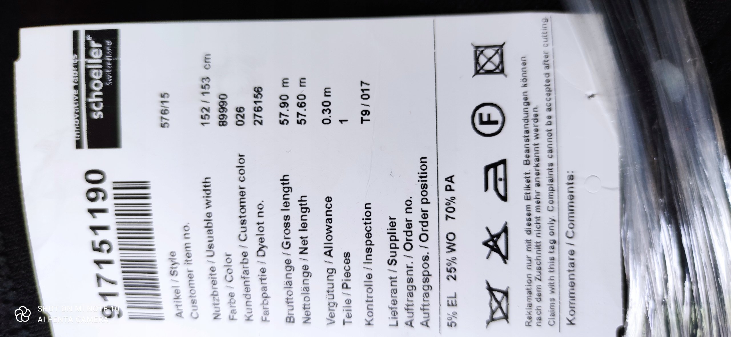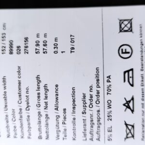 Dokładny skład tkaniny znajduje się na zdjęciu z oryginalną metką. cena za 0,5 mb czyli 1szt. kupując 3 szt. otrzymują państwo 1,5 mb tkaniny w jednym kawałku.